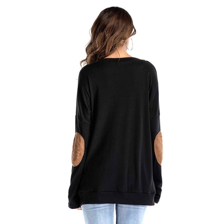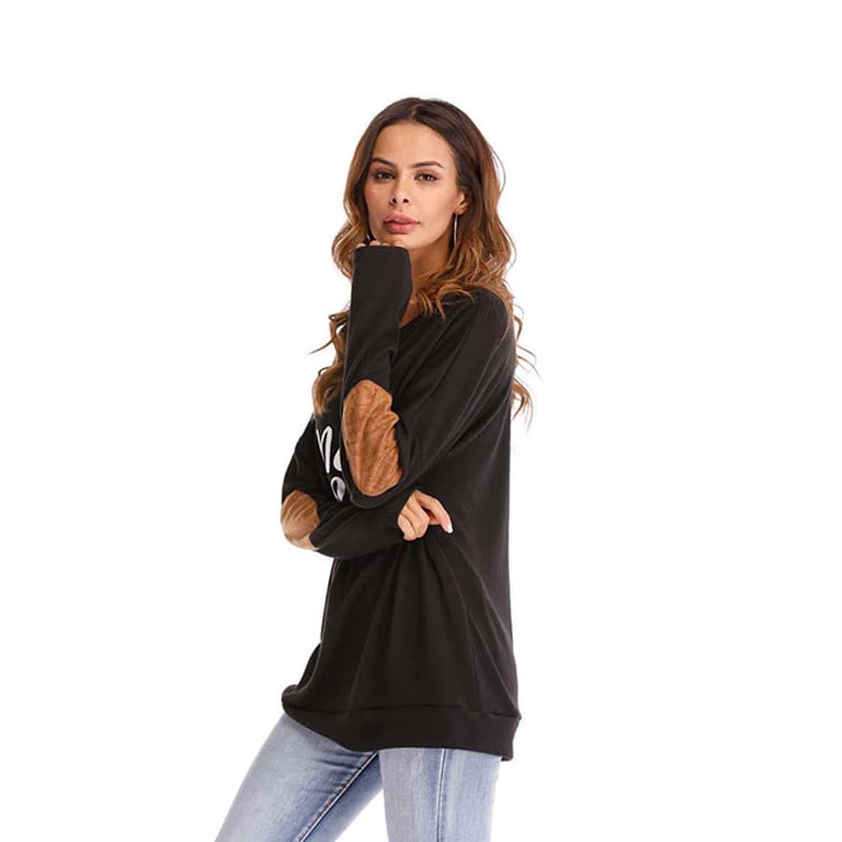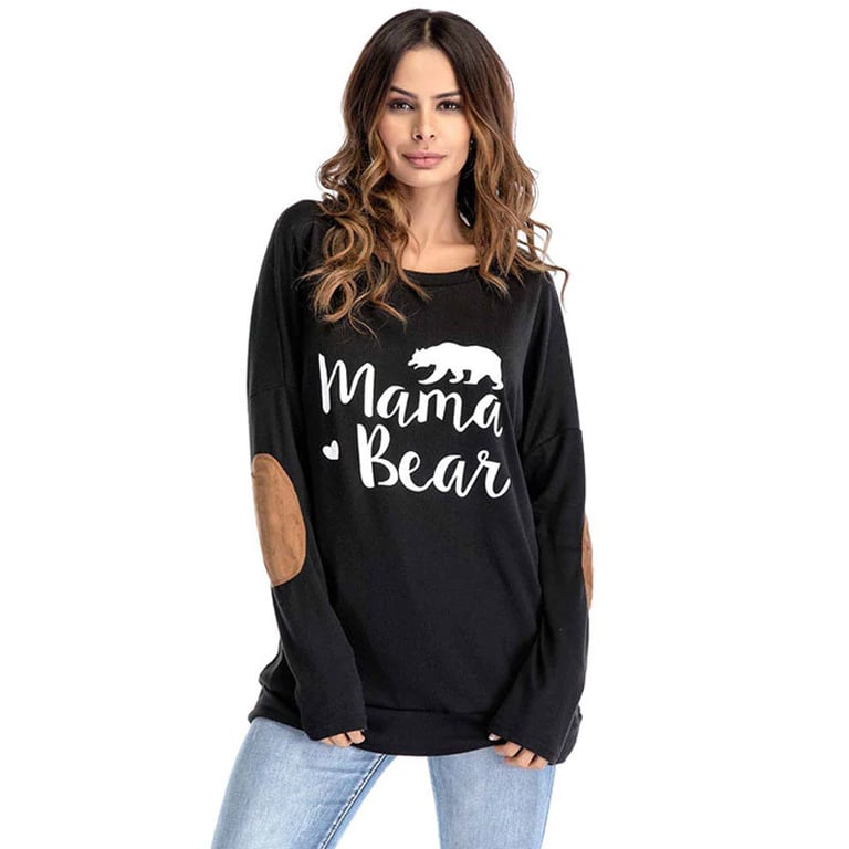 Camisa de mujer de manga larga “mamá oso”. La camiseta tiene un escote redondo y parches cosidos en los codos. Disponible en varias opciones de color.