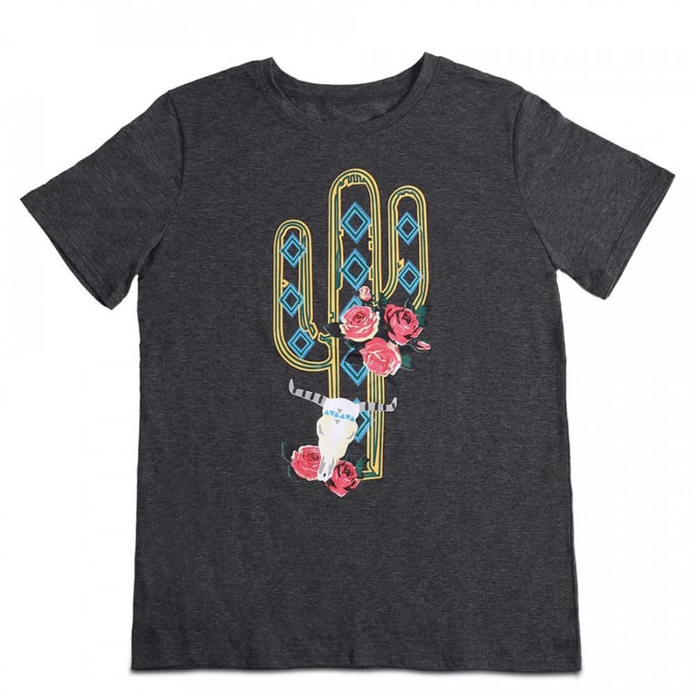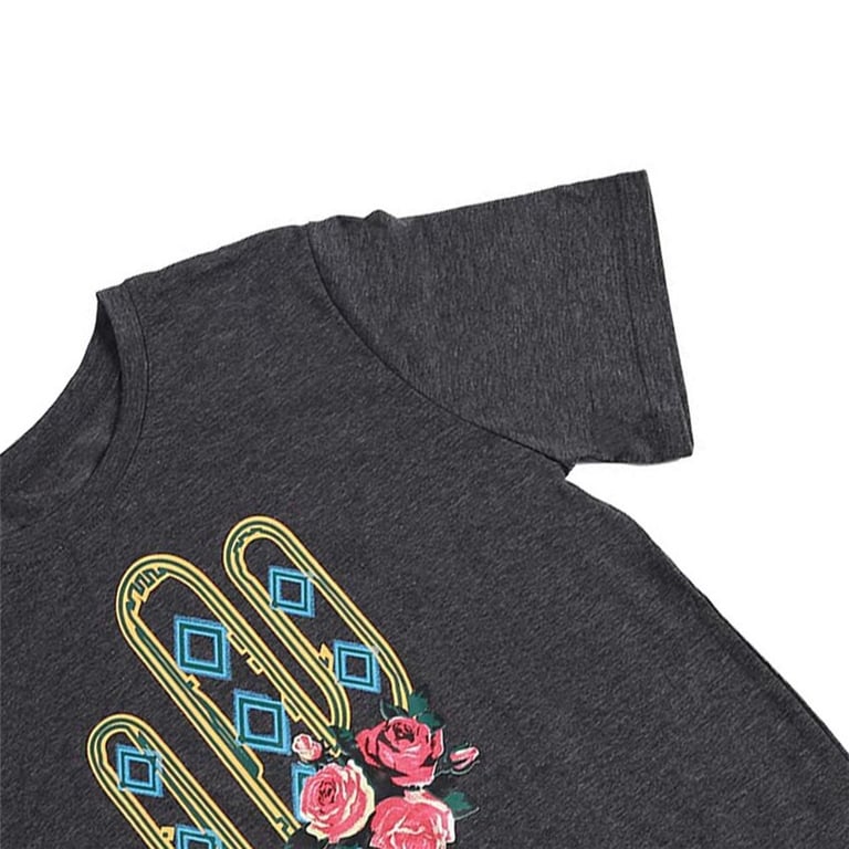 Camisa de mujer de manga corta y escote redondo. Impresión colorida con motivo de cactus. Corte recto y suelto.