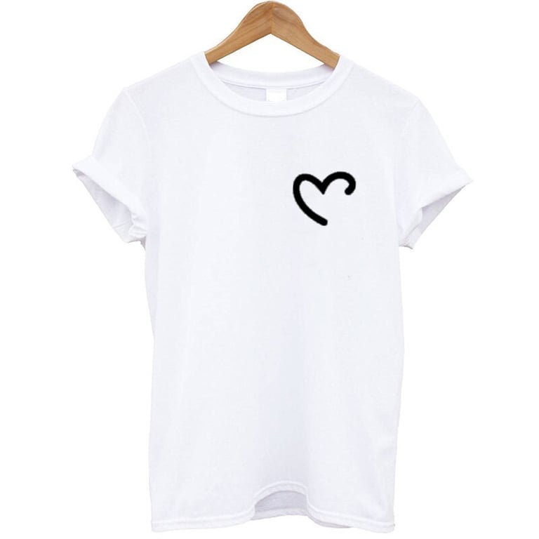 Camisa de mujer con mangas cortas dobladas y escote redondo. Estampado con un corazoncito en la parte delantera. Corte holgado. Disponible en varios colores.