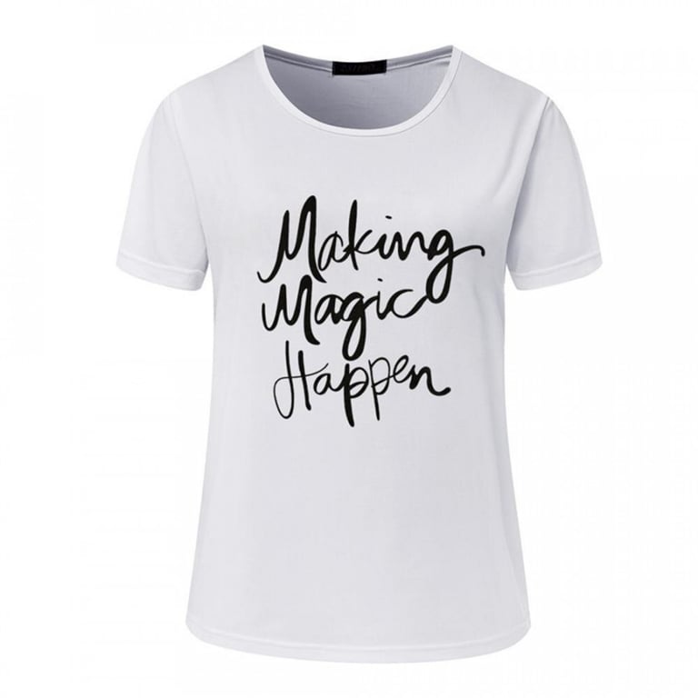 Camisa de mujer de manga corta. Impresión con texto en la parte delantera. Corte holgado con escote redondo. Varias opciones de color.
