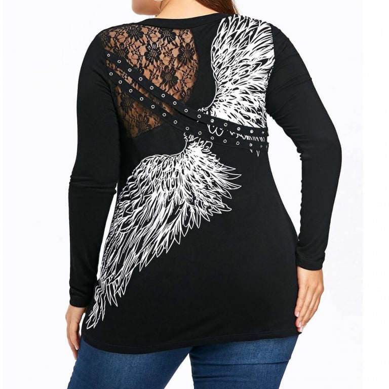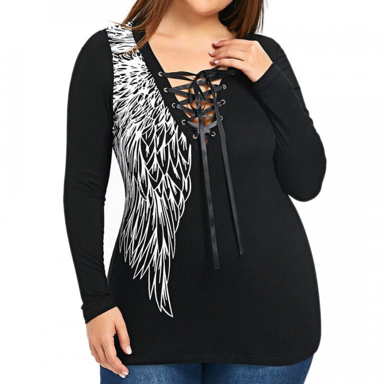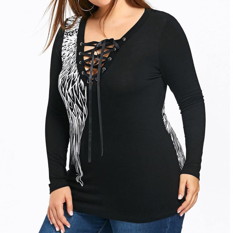 Camisa de mujer de manga larga con escote y cordones. Corte ajustado más largo. Impresión en la parte delantera. Tallas grandes. Disponible en varias opciones de color.