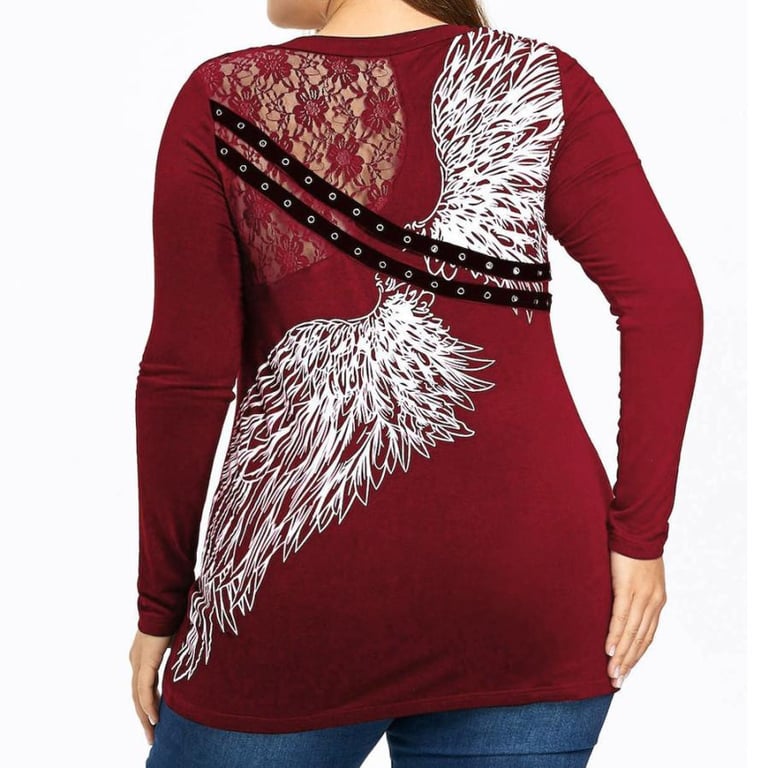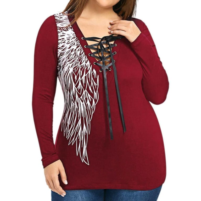 Camisa de mujer de manga larga con escote y cordones. Corte ajustado más largo. Estampado en la parte delantera. Tallas grandes disponibles. Varias opciones de color para elegir.