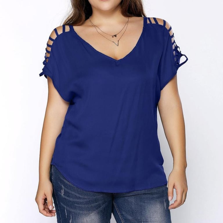 Camisa de mujer de manga corta con cortes decorativos. La camiseta tiene un escote en V y un corte holgado. Disponible en tallas grandes y en varias opciones de color.