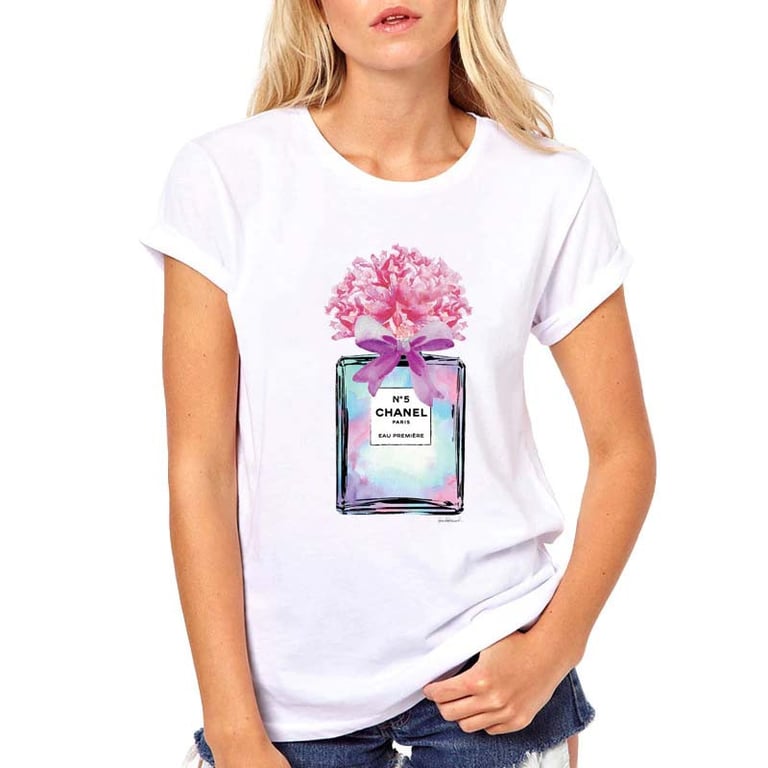 Camisa de mujer estilosa con un diseño de perfume, que se adapta a cualquier armario para diversas ocasiones. Esté cómoda, esté IN. El envío es gratuito.