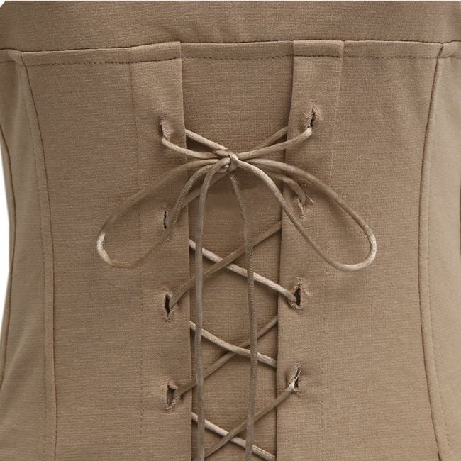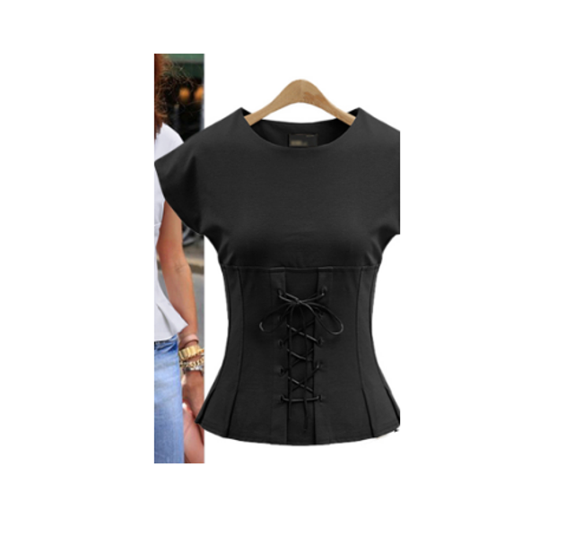 La camiseta tiene un color y una imitación estilizada de corsé desde la cintura hacia abajo, y es adecuada como complemento para el uso diario o eventos sociales.