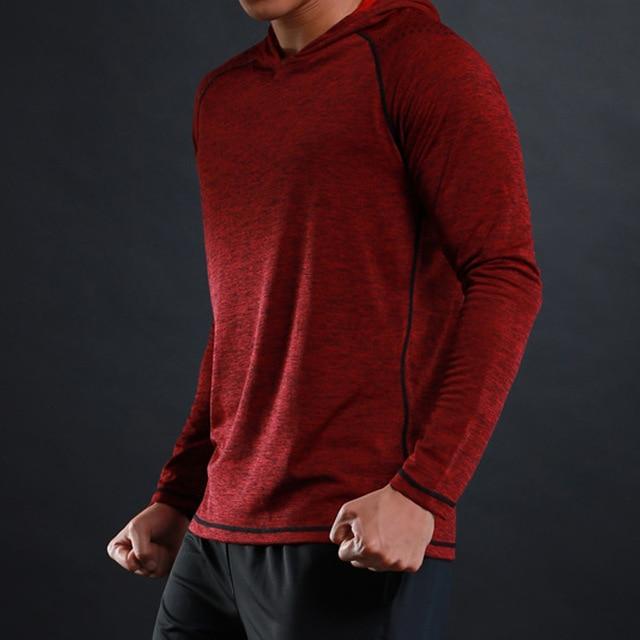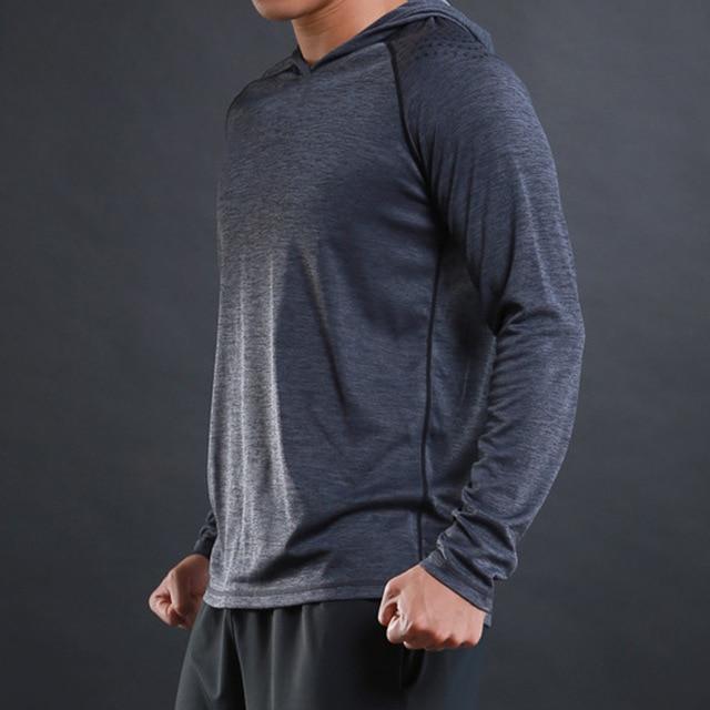 Camiseta deportiva para hombre con capucha, fabricada en poliéster. Ideal para el gimnasio, de secado rápido, absorbe bien el sudor.