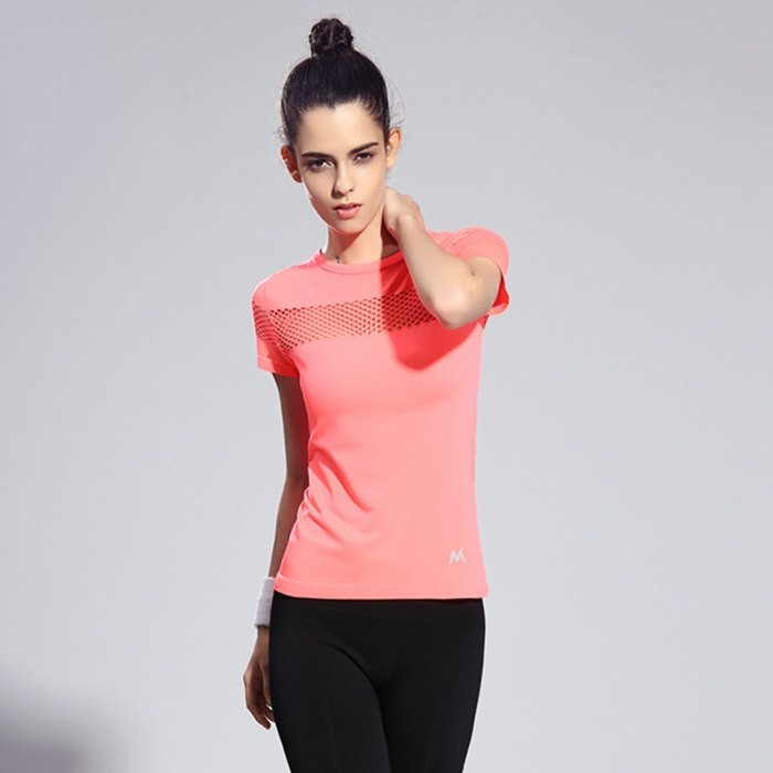 Camiseta deportiva de mujer de un solo color con escote redondo y manga corta. La camiseta está hecha de un material cómodo y transpirable que mantiene el cuerpo fresco y seco. Disponible en varias opciones de color.