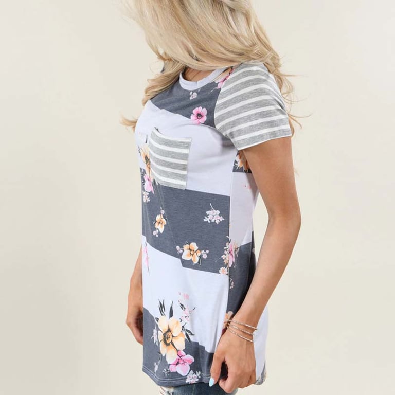 Elegante camiseta de mujer en colores agradables, con un motivo floral. Puedes llevarla a cualquier parte, así que ¿por qué no tener una pieza así en tu armario?
