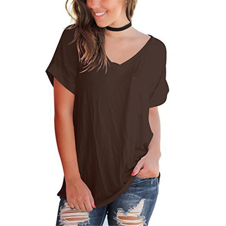 Camisa de mujer de manga corta con escote en V. La camiseta tiene un corte holgado y cómodo y un bolsillo en el pecho. Disponible en varias opciones de color.