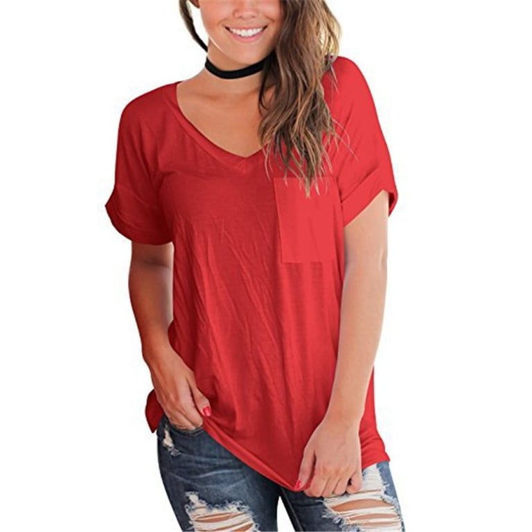 Camisa de mujer de manga corta con escote en V. La camiseta tiene un corte suelto y cómodo y un bolsillo en el pecho. Disponible en varias opciones de color.