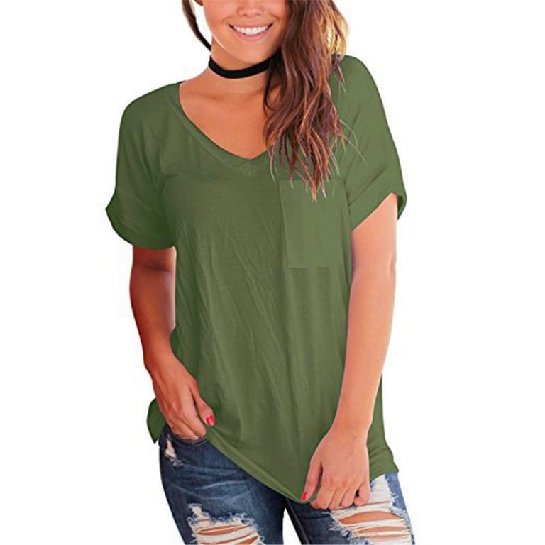 Camiseta de mujer de manga corta con escote en V. La camiseta tiene un corte holgado y un bolsillo en el pecho. Disponible en varias opciones de color.
