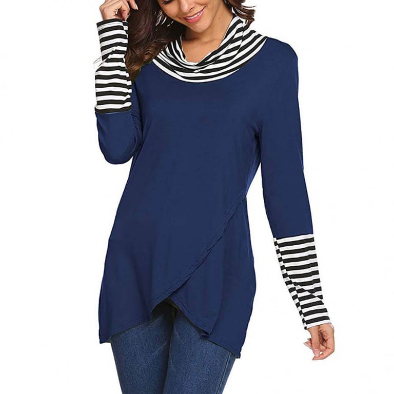 Camisa de mujer con cuello de chal y manga larga. Corte asimétrico más largo. Detalles con patrón a rayas. Disponible en varias opciones de color.