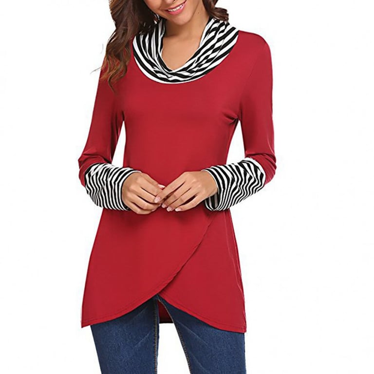 Camisa de mujer con cuello de chal y manga larga. Corte asimétrico más largo. Detalles con patrón a rayas. Disponible en varias opciones de color.