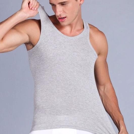 Camisa sin mangas de algodón para hombre de corte ajustado que resalta la figura. Material suave disponible en cuatro colores.