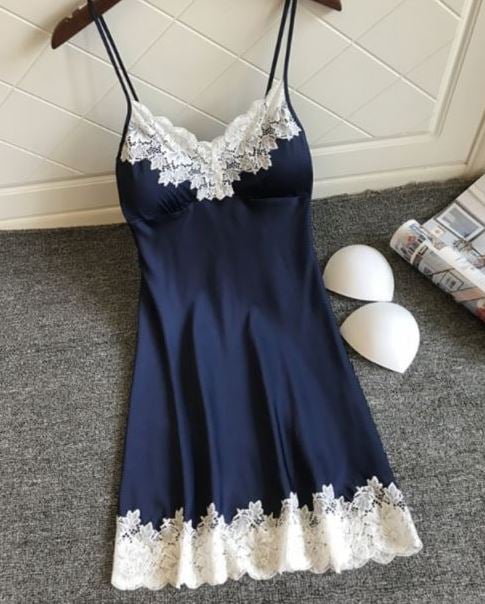 Camisa de noche atractiva adornada con encaje negro de flores.
