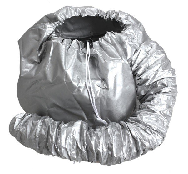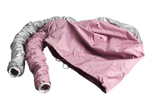 Colocamos la capucha en la cabeza y la ajustamos con el cordón. En el extremo del tubo colocamos el secador de cabello.
