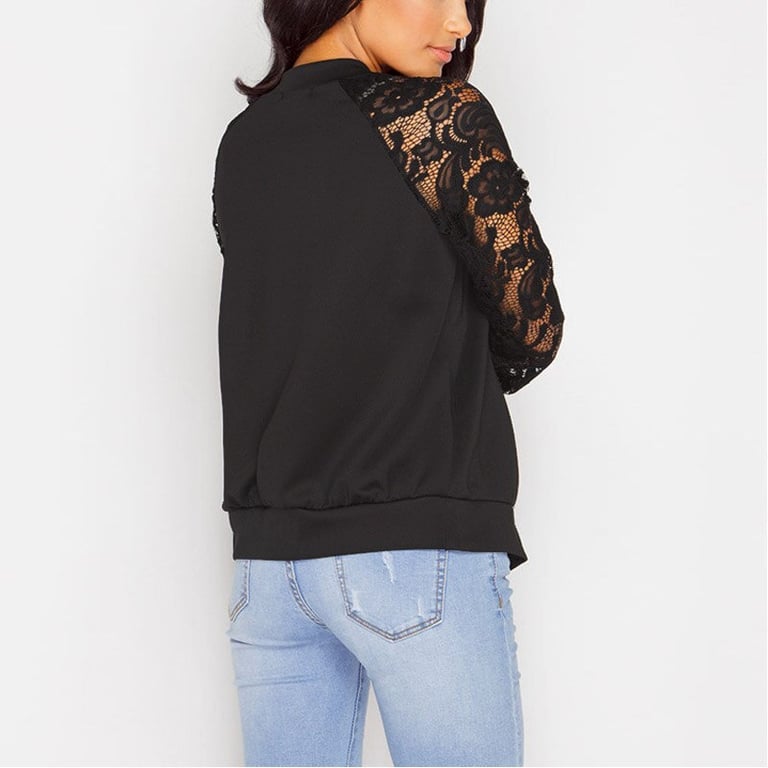 Chaqueta ligera de mujer estilo bomber. La chaqueta tiene mangas decoradas con encaje. Cierre de cremallera y cuello bajo. Disponible en dos variantes de color.