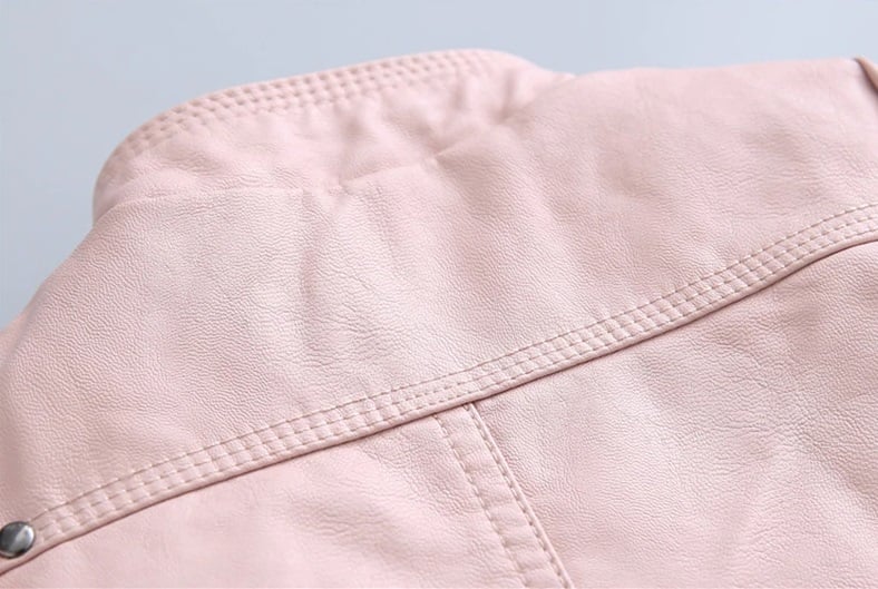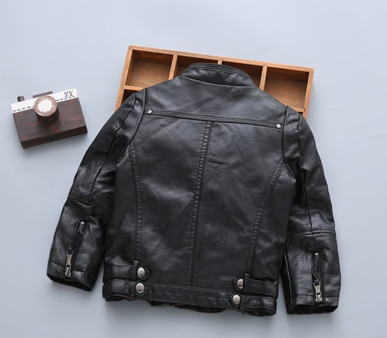 La chaqueta está hecha de cuero sintético y poliéster, te mantendrá caliente en climas más fríos y le quedará genial a tu hijo.