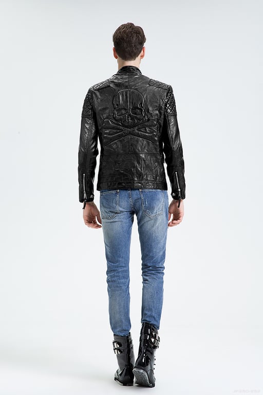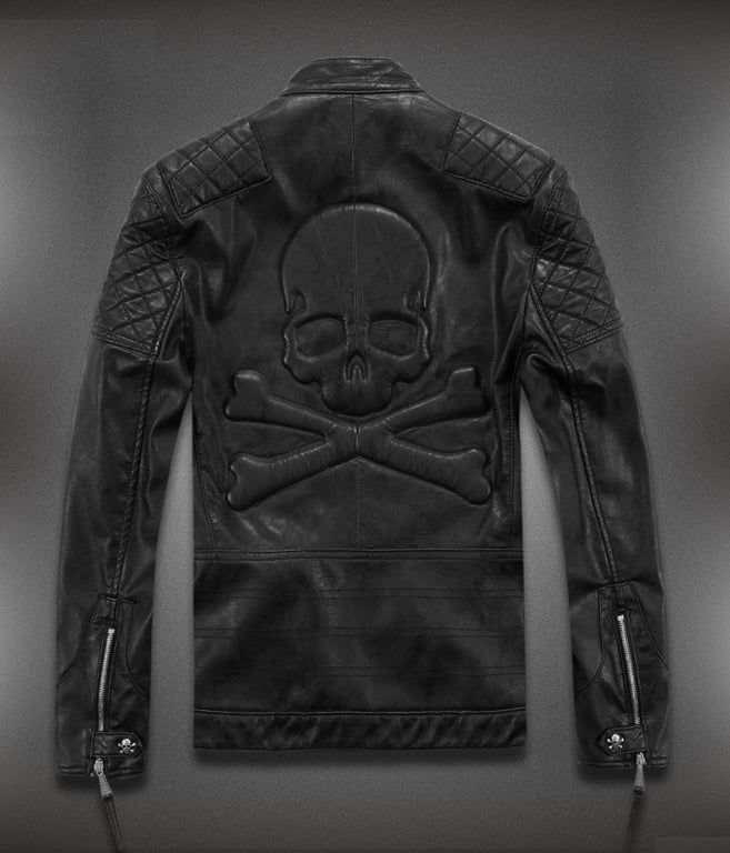 La chaqueta es de cuero y en la parte posterior tiene una enorme calavera.
