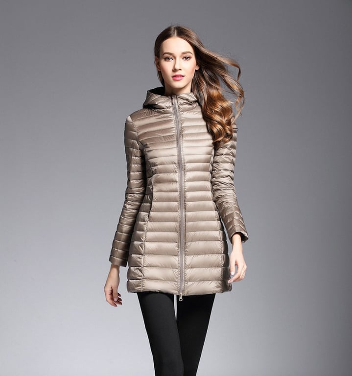 Chaqueta larga de mujer acolchada con capucha y bolsillos. Efecto brillante.