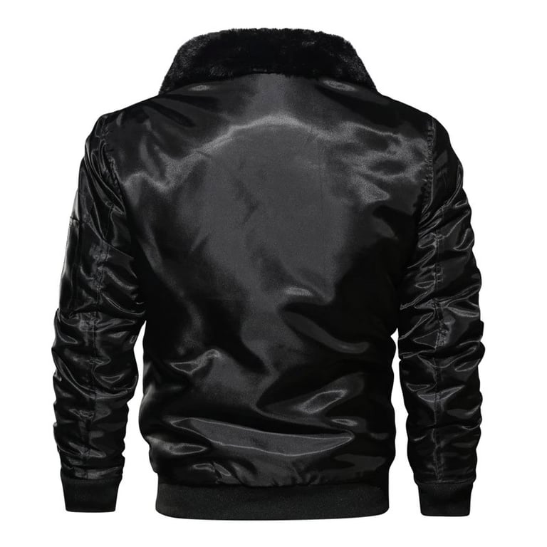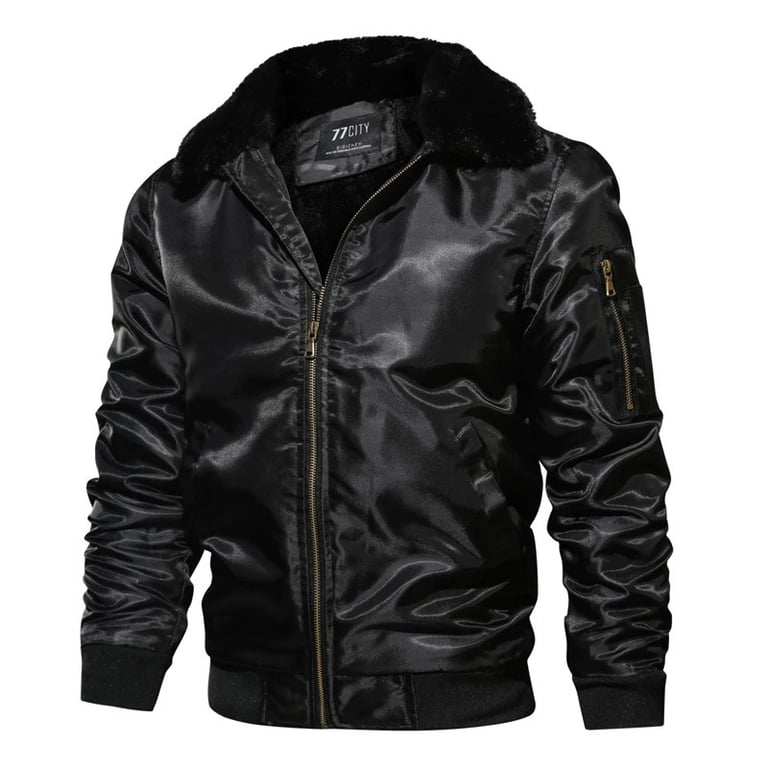 Chaqueta bomber de invierno para hombre con estilo. Sin capucha y con un gran cuello de piel. Cintura elástica y cierre de cremallera. Bolsillo lateral en la manga con cremallera. Disponible en tres variantes de color.