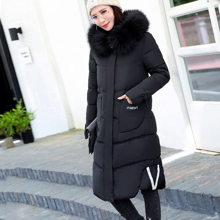 Chaqueta larga acolchada para mujer. La chaqueta tiene cierre de cremallera, capucha con un gran forro de piel cálido y un estampado en la parte posterior. Disponible en varias opciones de color.