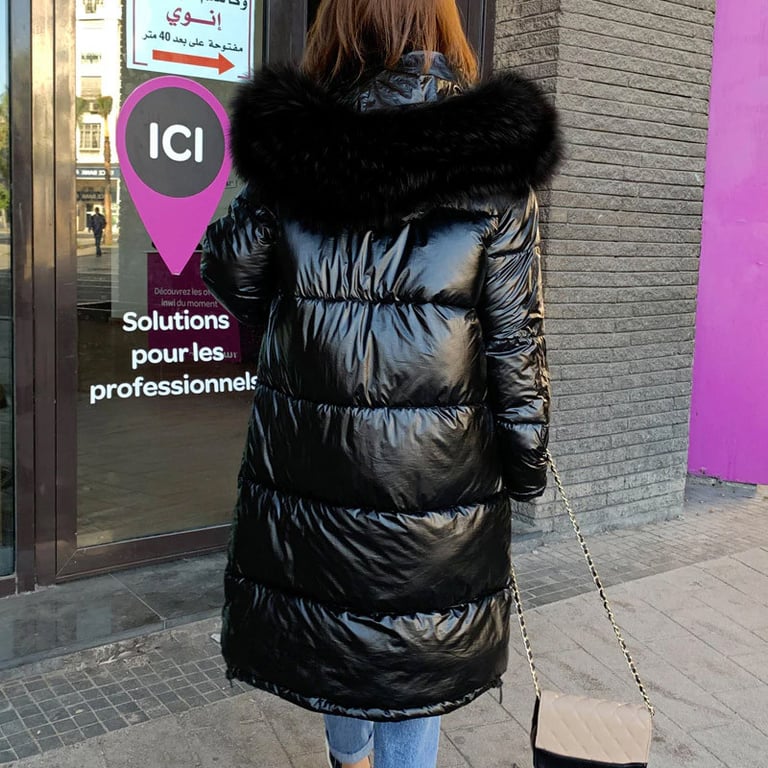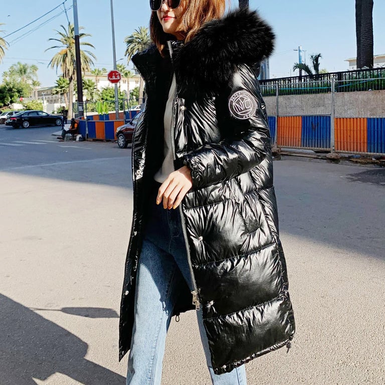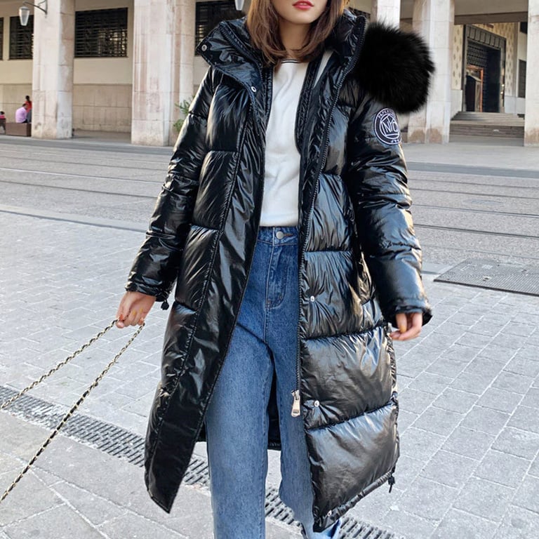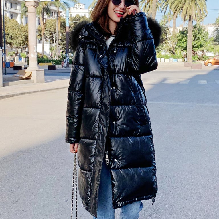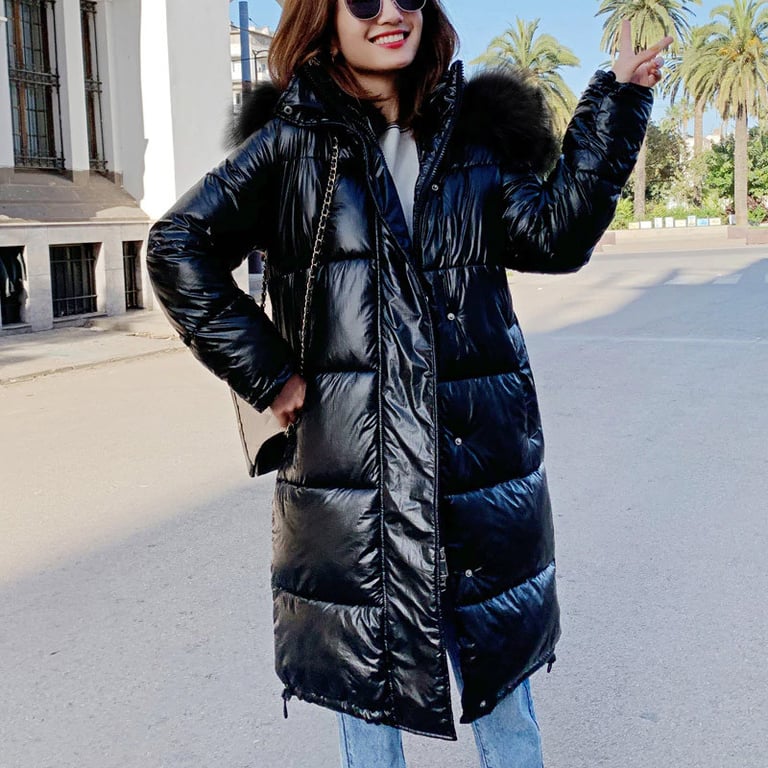Abrigo de invierno para mujer con acolchado. Corte largo y recto con capucha y gran forro de piel cálido. Superficie lisa y brillante. Cierre con cremallera y botones a presión. Varias opciones de color.