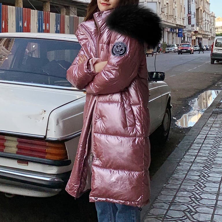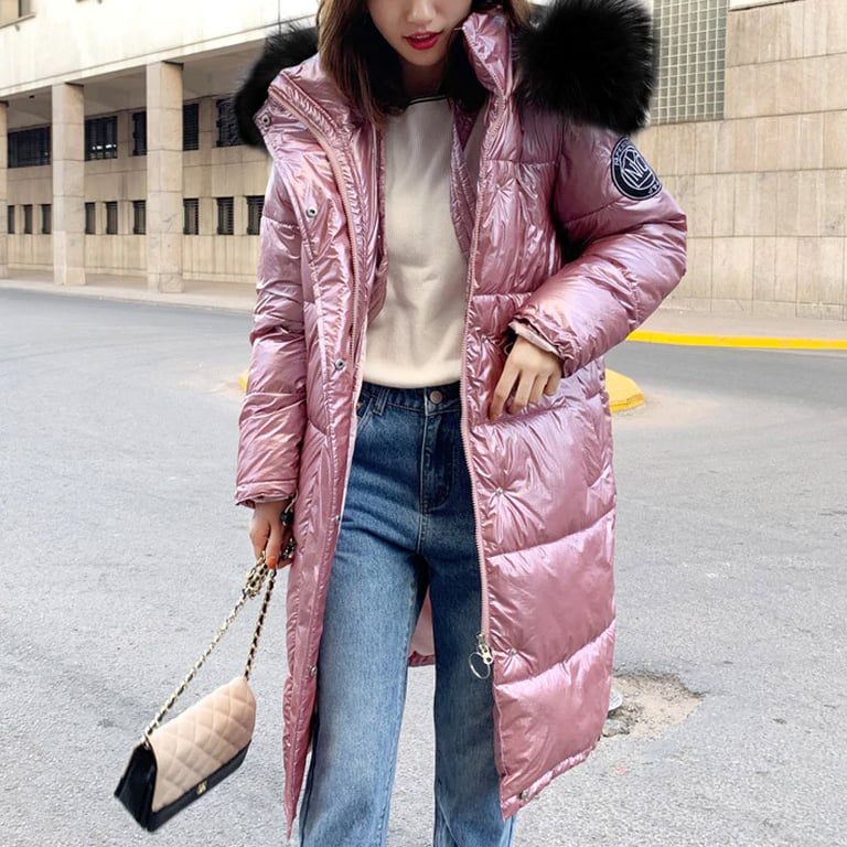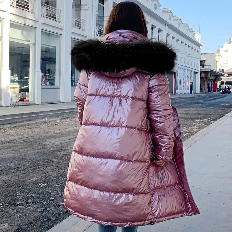 Abrigo de invierno para mujer con acolchado. Corte largo y recto con capucha y gran forro de piel cálido. Superficie lisa y brillante. Cierre con cremallera y botones a presión. Varias opciones de color.