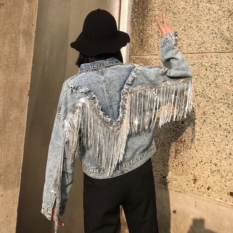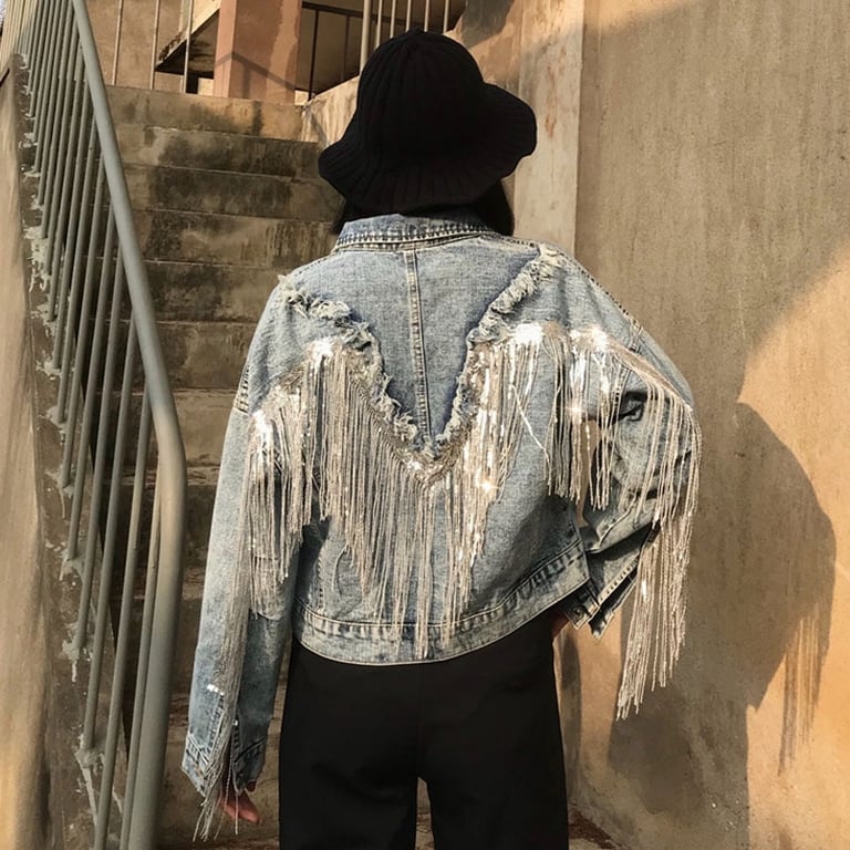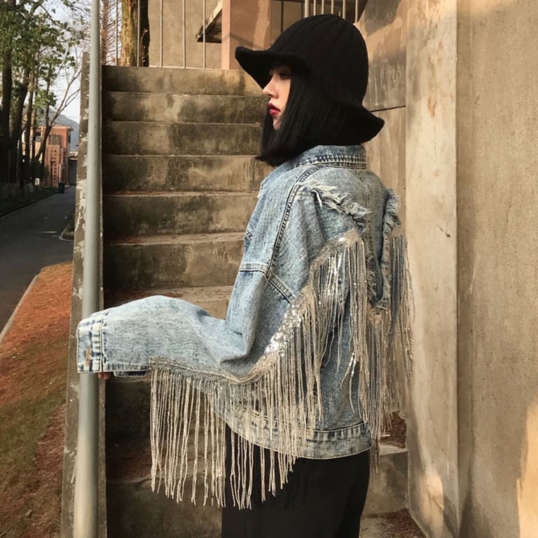 • Etiquetas: chaqueta de mujer, chaqueta de mezclilla, chaqueta con flecos, chaqueta original