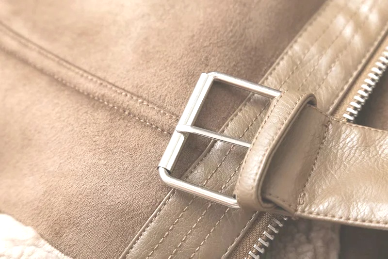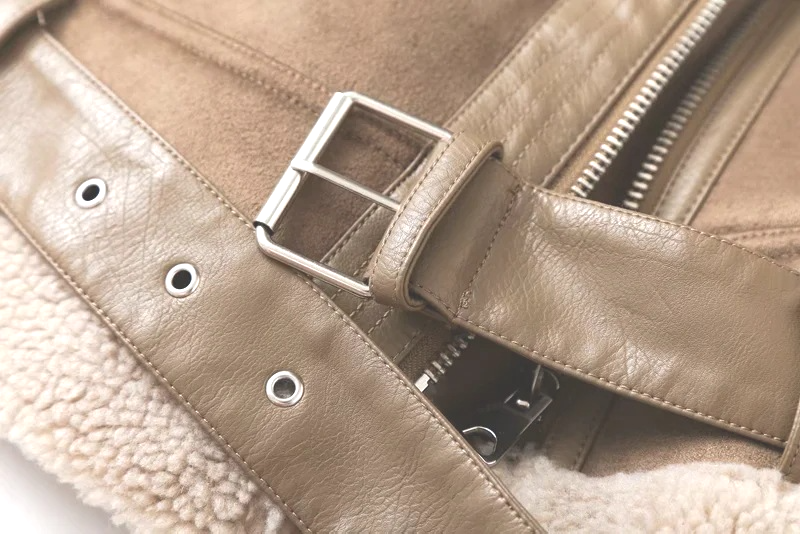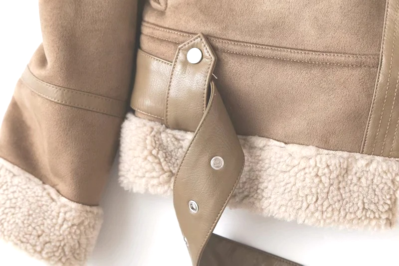 La característica destacada de la chaqueta es el cinturón en la parte inferior y el gran cuello. Las mangas y el dobladillo inferior de la chaqueta también merecen atención.