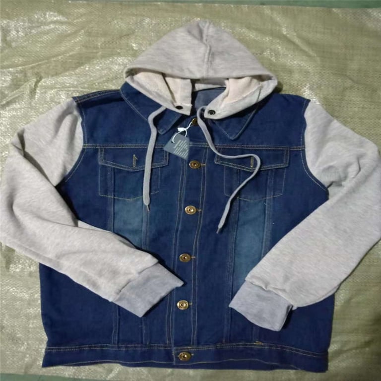 Chaqueta de mezclilla estilosa con mangas de sudadera y capucha.