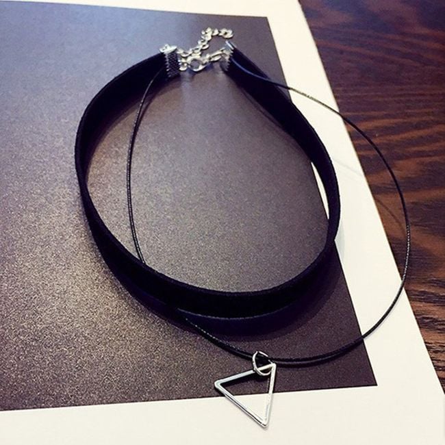 El ingenioso collar choker de múltiples capas con un colgante en forma de triángulo resalta maravillosamente su estilo personal. Gracias al cierre de cadena, se puede ajustar el tamaño. La longitud es de 28 a 32 cm. Disponible en color negro.