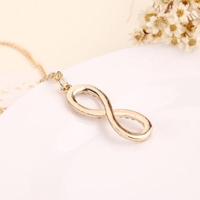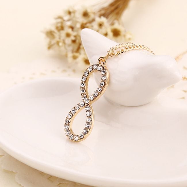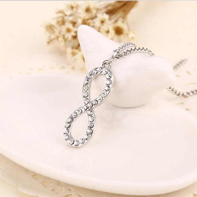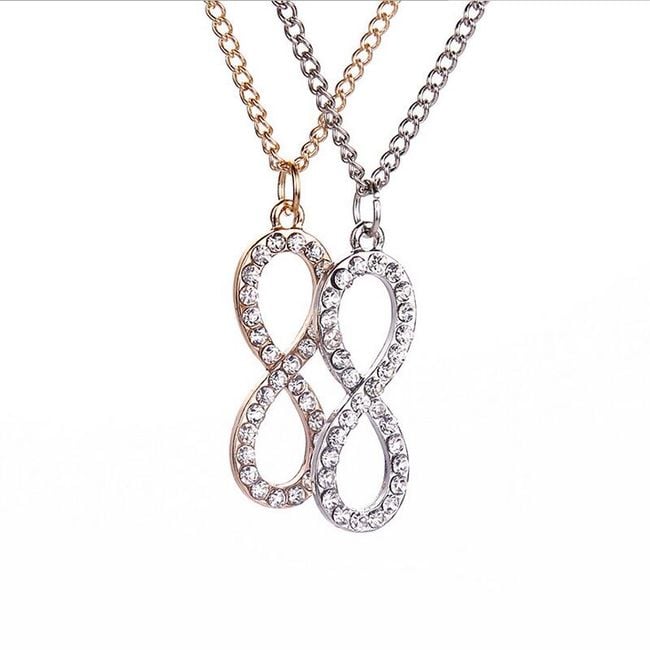 Hermoso collar con piedras en forma de infinito en dos colores.