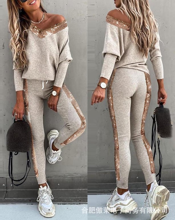 Conjunto de chándal de mujer de un solo color decorado con lentejuelas