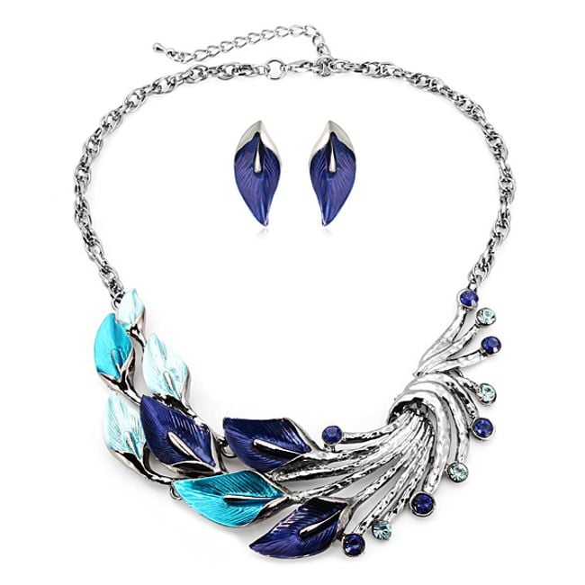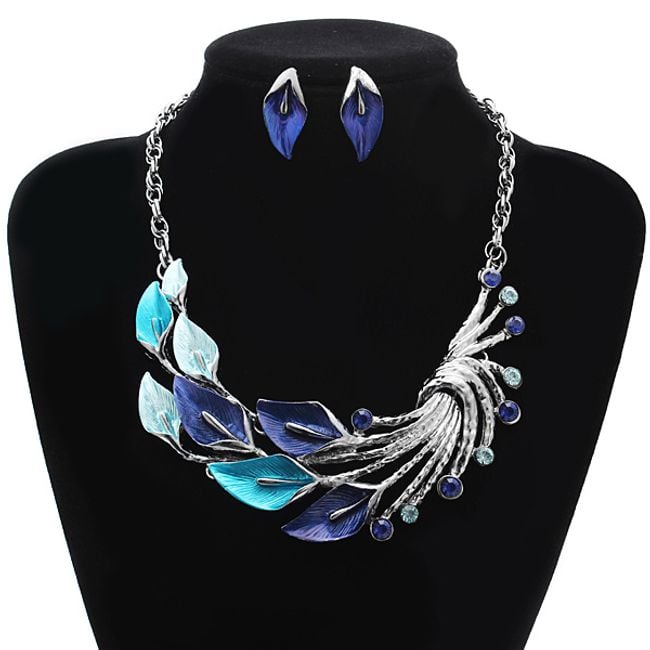 ¿Quieres impresionar en la fiesta de la empresa? Prueba con este bonito conjunto de collar y pendientes con un diseño de hojas. El colgante del collar es llamativo y elaborado, decorado con piedras de vidrio tallado que combinan en color con todo el conjunto. Los pendientes también están moldeados en pequeñas hojas.