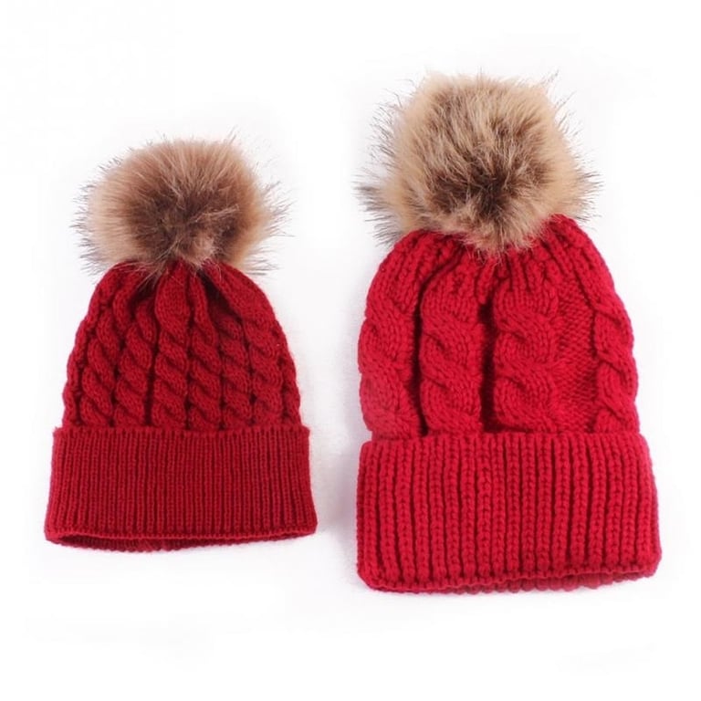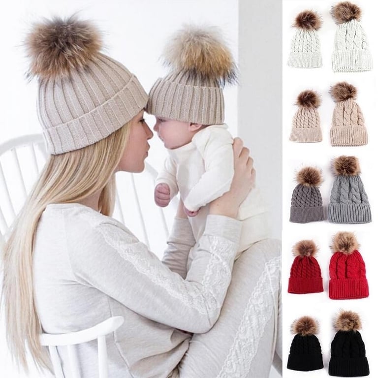 Gorros de moda con pompón para los más pequeños junto con un gorro para adultos.