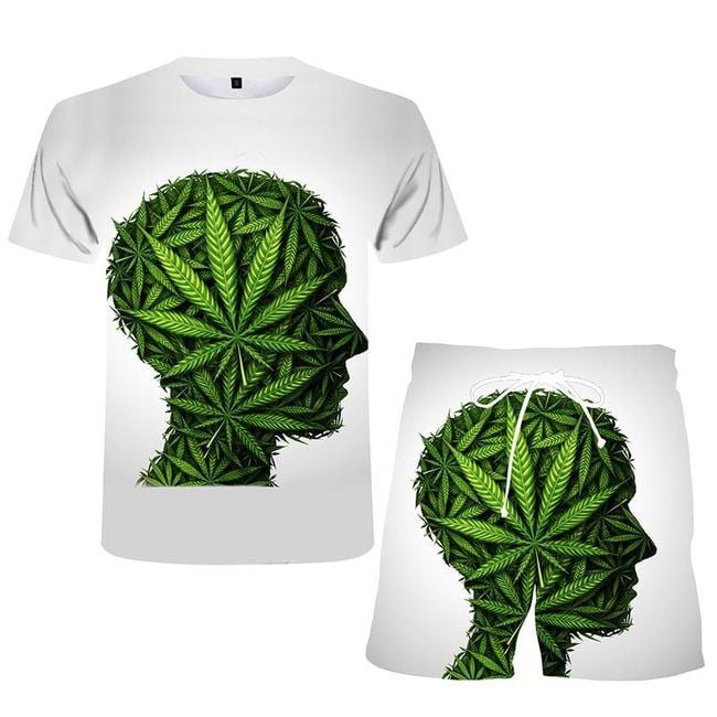 Conjunto de hombre, camiseta y pantalones cortos con motivo de marihuana.