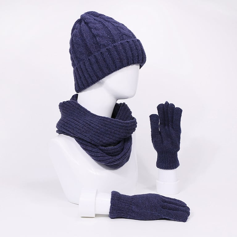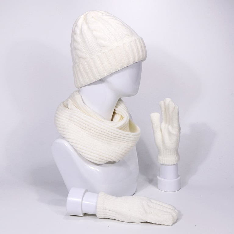 Conjunto de invierno único para mujer que incluye un gorro, una bufanda y un par de guantes.