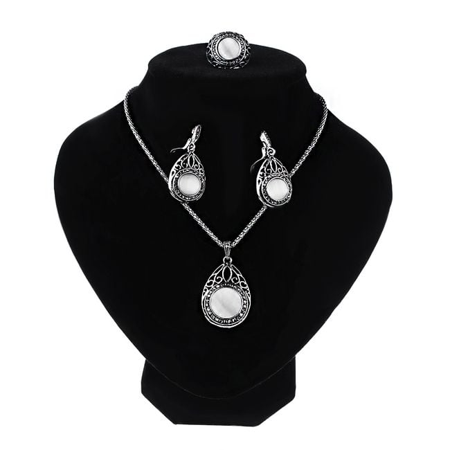 • Dimensiones: cadena: 40 + 5 cm, pendientes: 4.4 x 2.2 cm, anillo: 7: 17 mm, 8: 18 mm, 9: 19 mm