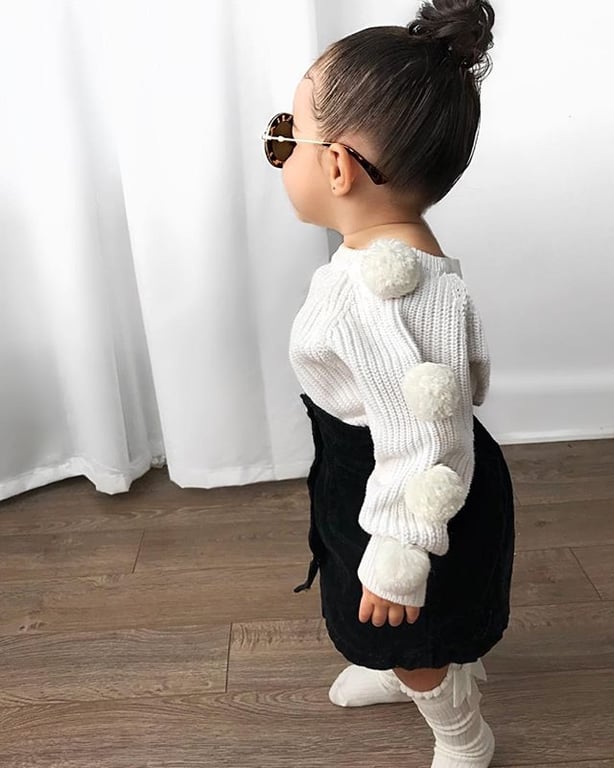Etiquetas: conjunto niña, set niña, set infantil, outfit, suéter esponjoso, suéter con pompones, suéter, falda de mezclilla, falda con botones, falda con botones