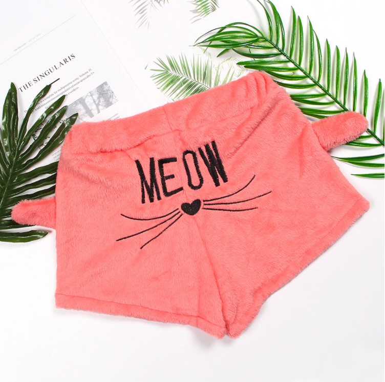 En la capucha y en los lados de los pantalones cortos hay orejitas de gato, y en la parte trasera el texto MEOW.