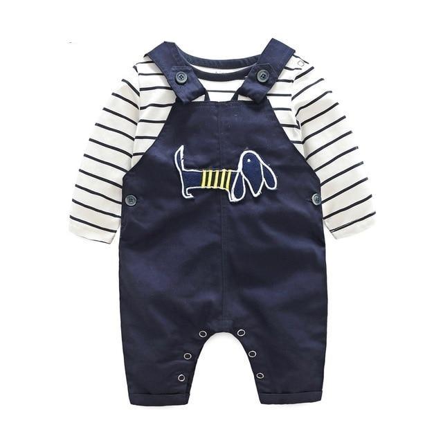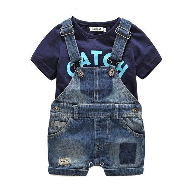 Conjunto de overoles de mezclilla y camiseta para niño.