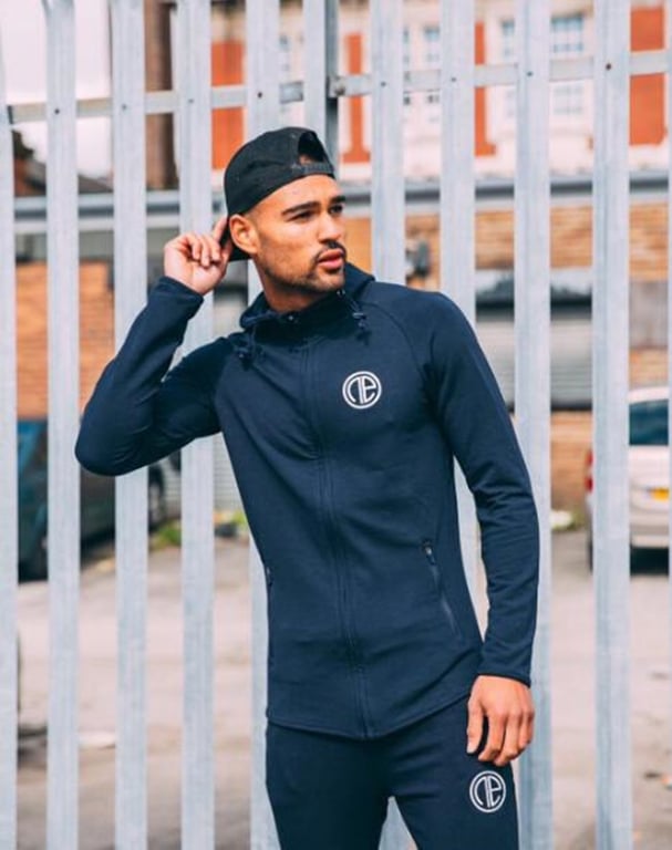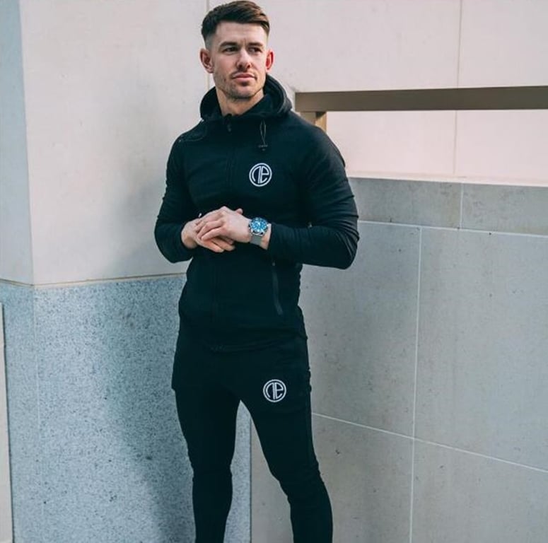 Este conjunto está compuesto por una sudadera con capucha y pantalones.