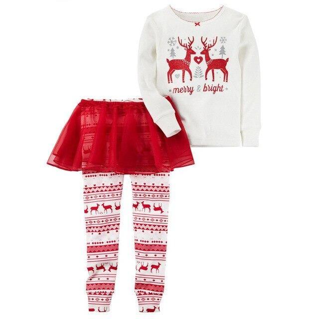 Conjunto navideño para niñas. Sudadera con ciervos, falda y leggings.