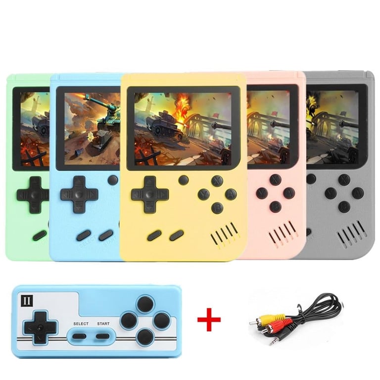 Consola de juegos retro con controlador en varios colores.