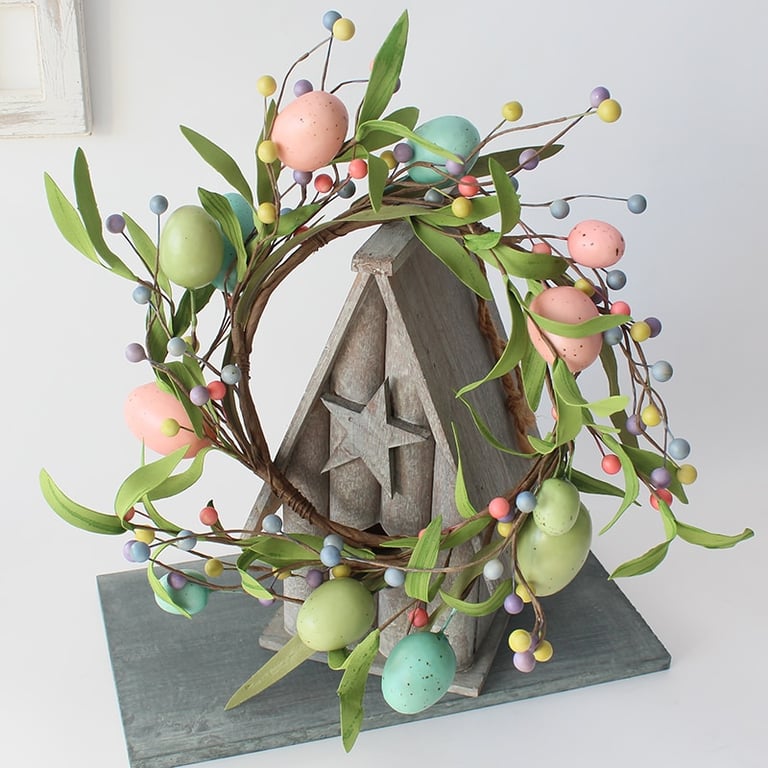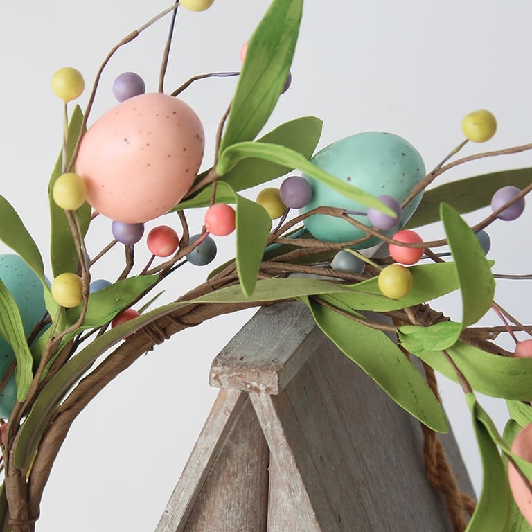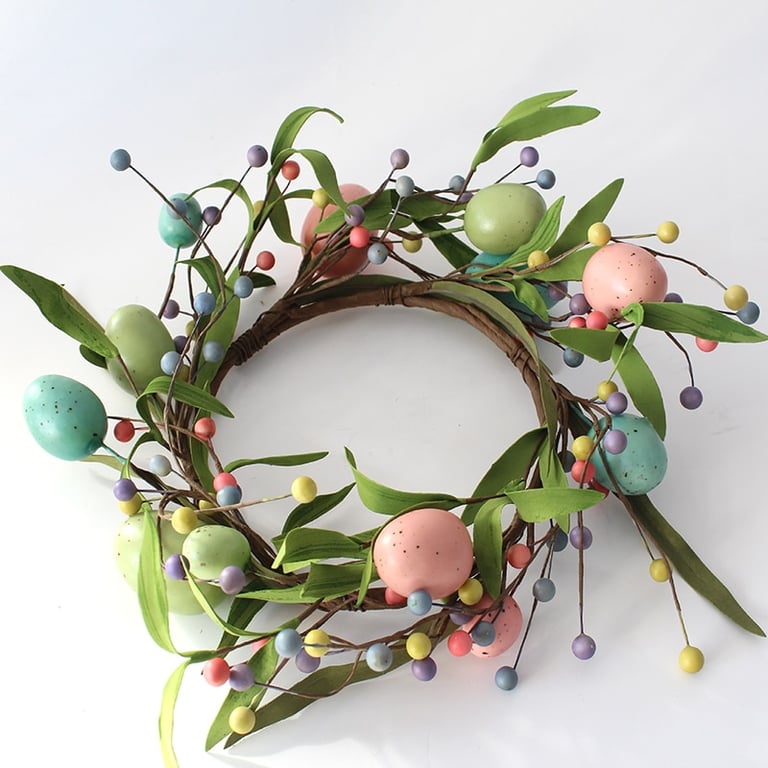 Hermosa corona de Pascua decorada con huevos de colores.