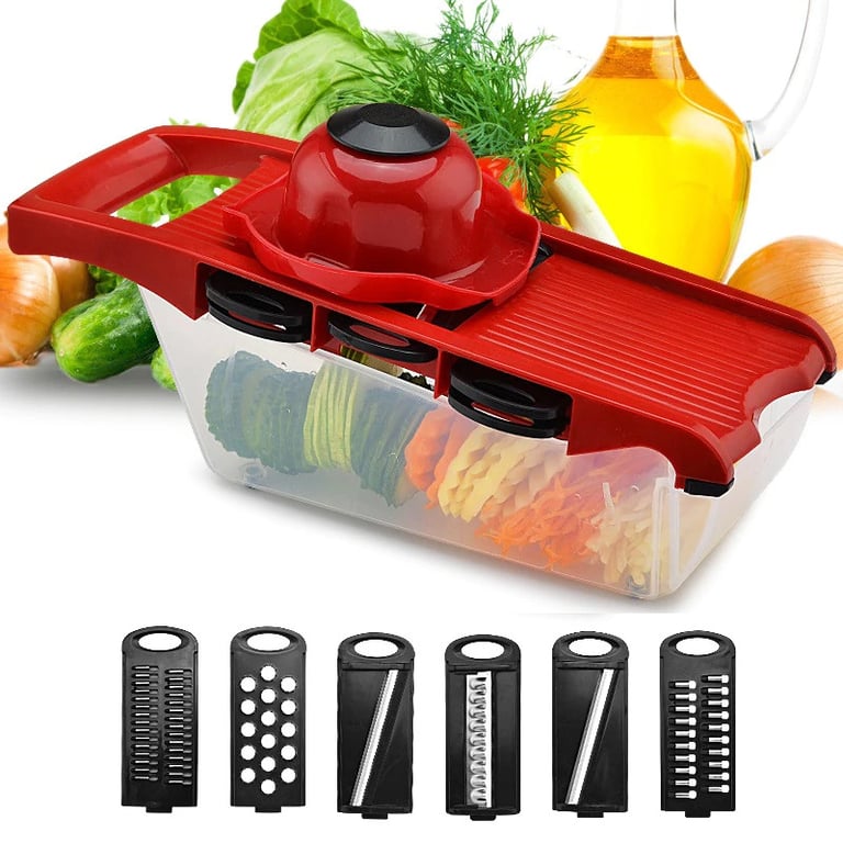 En el paquete encontrará una placa de sujeción para 6 cuchillas intercambiables, cada una de las cuales corta una forma diferente en la caja incluida. Puede elegir con caja o sin ella (la variante sin caja incluye solo 5 cuchillas). El cortador tiene un accesorio para sujetar verduras, que protege sus dedos de lesiones y facilita todo el proceso de corte.