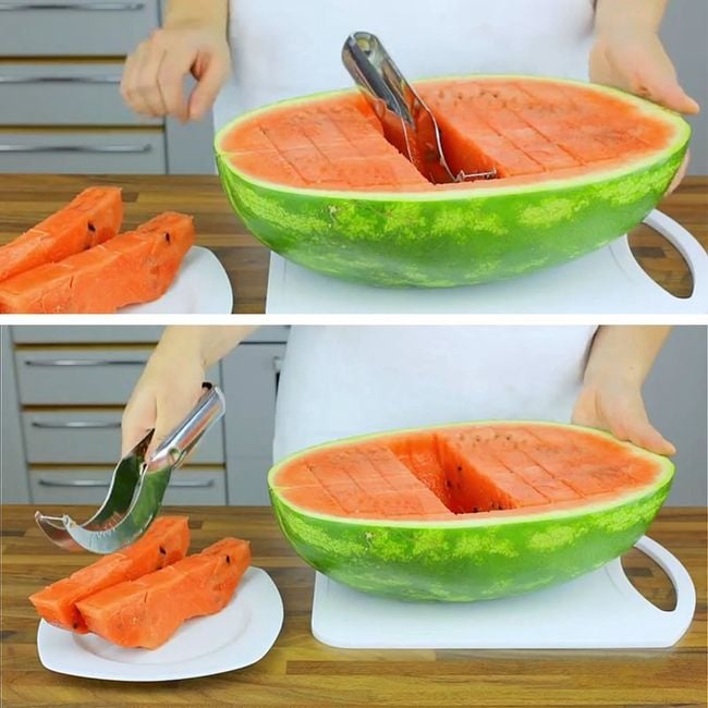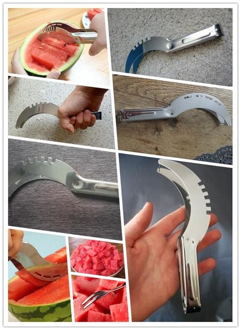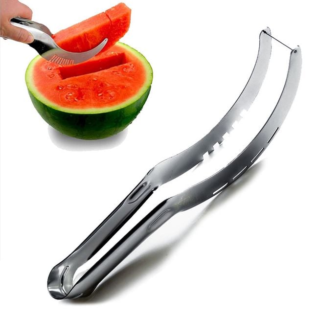 ¡Un práctico cortador de sandía que todos nosotros podemos utilizar y que no debe faltar en ninguna cocina! Corta perfectamente trozos de sandía y al mismo tiempo funciona como unas pinzas.