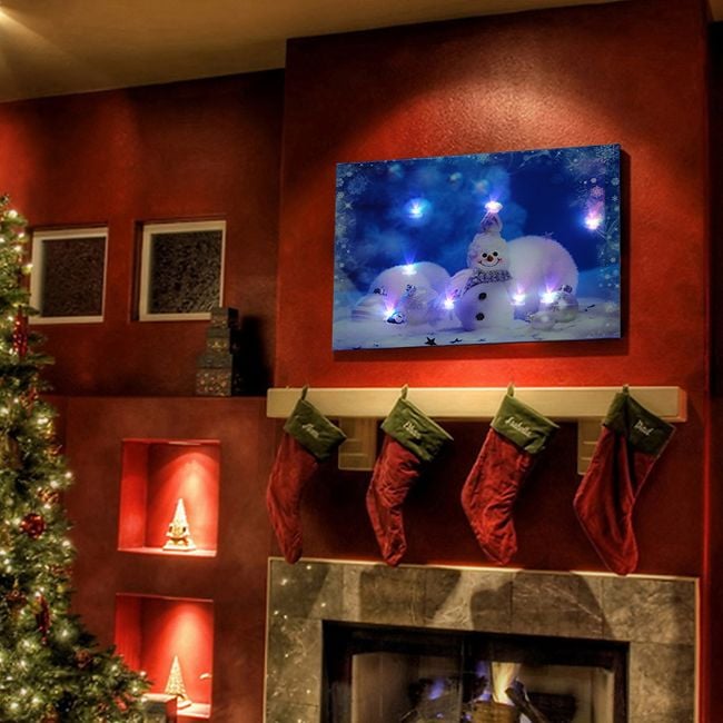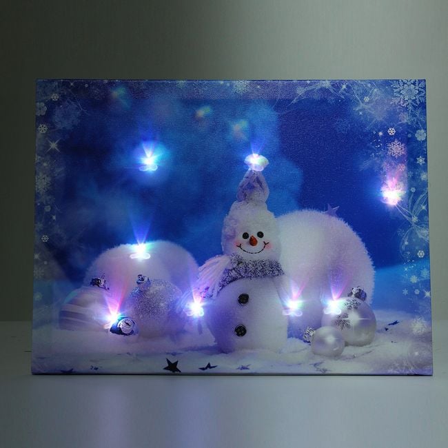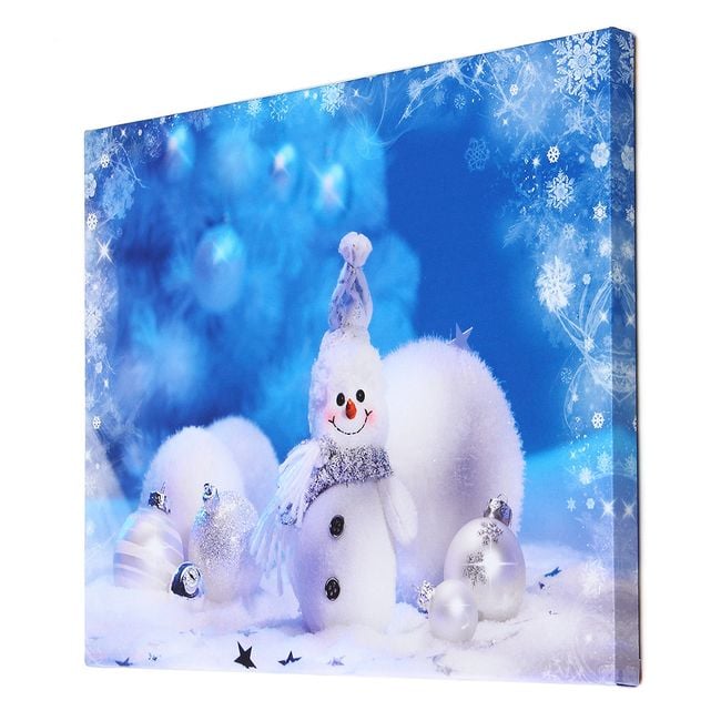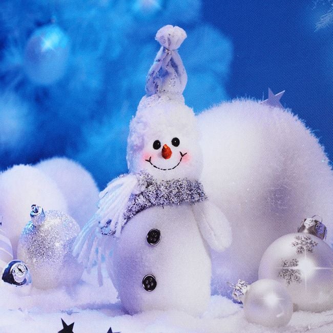 El lienzo tiene un motivo navideño: está representado un muñeco de nieve y adornos.