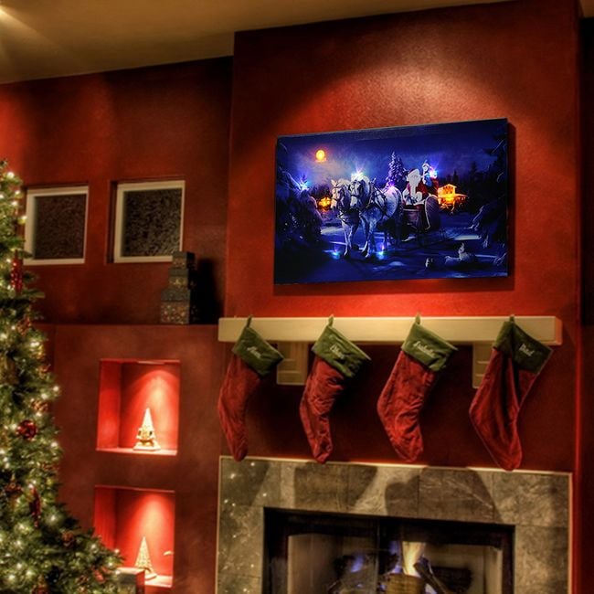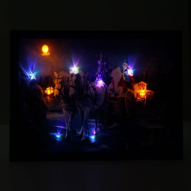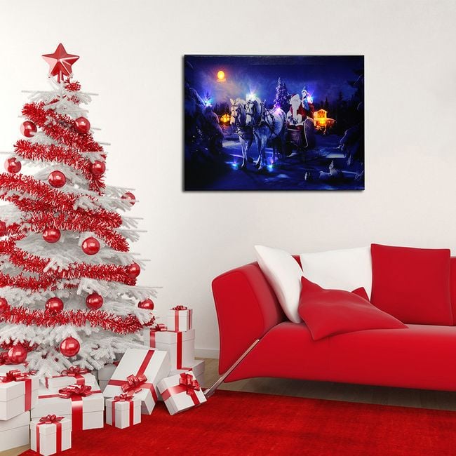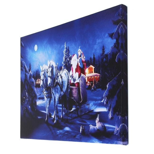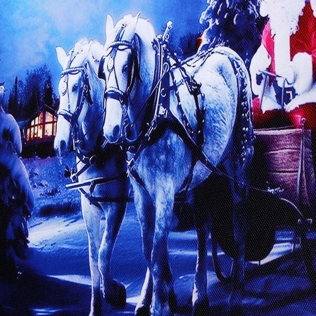 El lienzo tiene un motivo navideño: está representado Papá Noel y un trineo tirado por caballos.